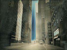 At their most dramatic, as in shots of New York City sky and sun above skyscrapers, Central Park, or the East River, the azure and cobalt blues that result from intentional overexposure convey a dreamlike beauty seeping through the austere sepia of the daguerreotype. This effect, at its best in subtle yet startling slivers of blue light that activate the stolid architecture and solid geometry of the subject matter, makes a seamless connection between photography's beginnings and its postmodernist project.